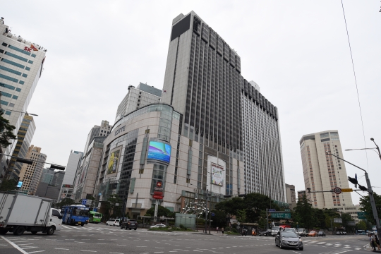 롯데백화점 외벽에 'LOTTE'라고 쓴 글씨가 선명하게 보인다. /김승호