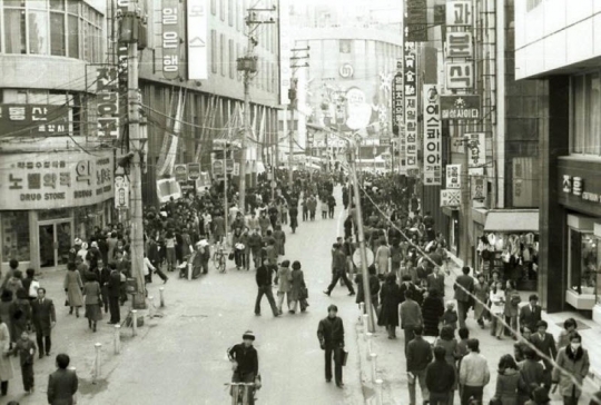 롯데호텔, 롯데백화점 등이 위치한 서울 명동은 우리나라 근·현대사에서 가장 상업이 발달한 대표적인 곳이다. 1976년 12월 명동의 전경./서울사진아카이브