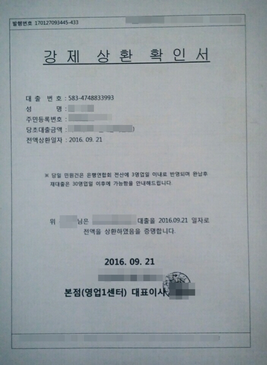완납증명서를 보던 김씨는 잘못 기재된 자신의 주민번호, 이름, 대출금액 등을 보고 의심을 하게 된다. 곧바로 저축은행에 전화해 완납 여부를 물었으나 저축은행측은 들어온 돈이 없다고 답했다.