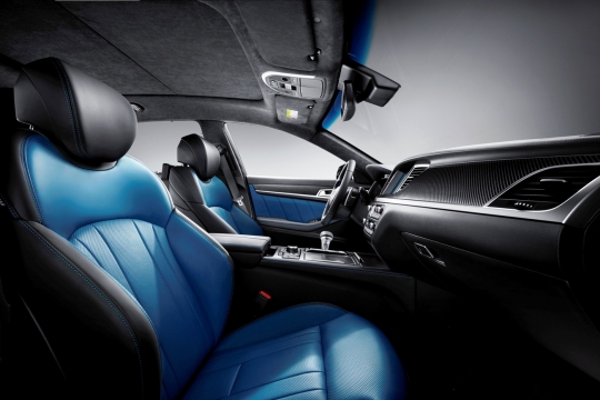 '스포츠 블루' 컬러로 포인트를 준 스포츠 전용 시트와 3스포크 타입의 전용 스티어링휠, 대시보드 등에 리얼 카본과 스트라이프 패턴의 리얼 알루미늄 소재 적용, 블랙 스웨이드 소재의 헤드라이닝(천장 부위) 등으로 고급감과 스포티한 감성을 살린 G80 스포츠의 실내 모습.
