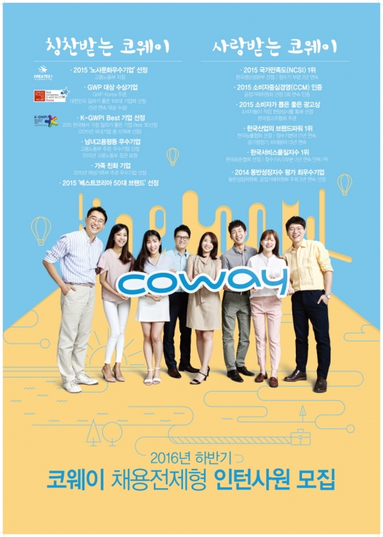 코웨이가 채용을 전제로 하는 '2016년 하반기 인턴사원'을 이달 25일까지 모집한다고 12일 밝혔다.