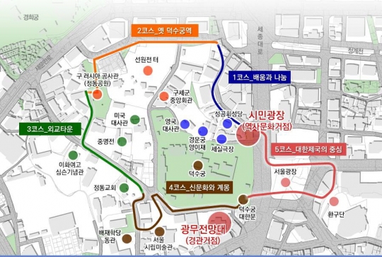 우선 역사재생전략의 핵심은 새로운 거점공간 2곳(▲서소문청사 ▲옛 국세청 별관부지)을 신설한다. 이 거점과 기존의 다양한 역사문화자원들을 연결한 5개 코스, 2.6km의 역사탐방로 '대한제국의 길(Korean Empire Trail)'을 조성하는 것이다.