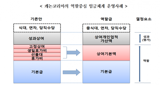 일본에 본사를 둔 캐논코리아. 캐논코리아는 국내 진입 초기엔 임직원 임금이 기본급과 고정상여, 생일휴가비, 선물대, 휴가비 그리고 성과상여로 구성돼 있었다. 여기에 식대와 연차·당직수당이 더해진 구조였다.