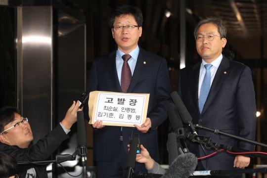 민주당 안호영 법률위원장이 최순실씨와 안종범 전 수석, 김기춘 전 비서실장과 김종 문화체육관광부 제2차관에 대해 고발장을 제출하기 위해 31일 오전 서울 서초구 서울중앙지방검찰청으로 들어서고 있다.