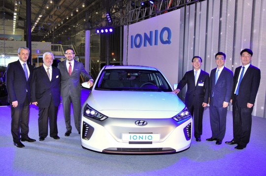 엘후리 그룹 후안 파블로 엘후리 매니저, 엘후리 그룹 후안 엘후리 회장, 네오현대(에콰도르 현지 현대차 딜러사) 마르코스 말로 대표, 주 에콰도르 이은철 대사, 현대자동차 해외홍보담당 구자용 상무, 현대자동차 중남미지역본부 박채훈 이사(왼쪽부터)가 아이오닉 일렉트릭 차량 앞에서 기념사진을 촬영하고 있다.