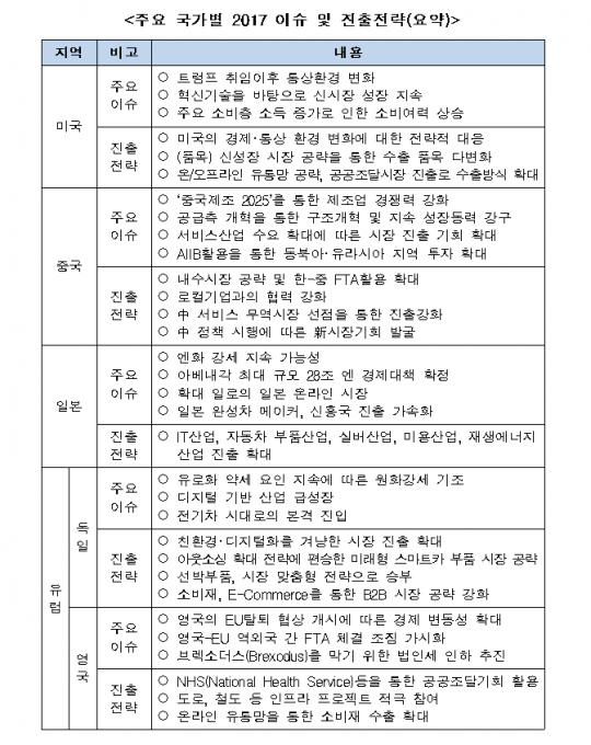 코트라(KOTRA)는 세계 85개국에 대한 '2017년 진출전략 보고서'를 29일 발간하고 이같이 밝혔다. 보고서는 KOTRA의 세계 각국 해외무역관 네트워크를 가동해 작성했다. 여기에는 국가별 주요 이슈를 비롯해 진출 환경, 시장 분석, 유망 품목, 진출 전략 등을 담았다.