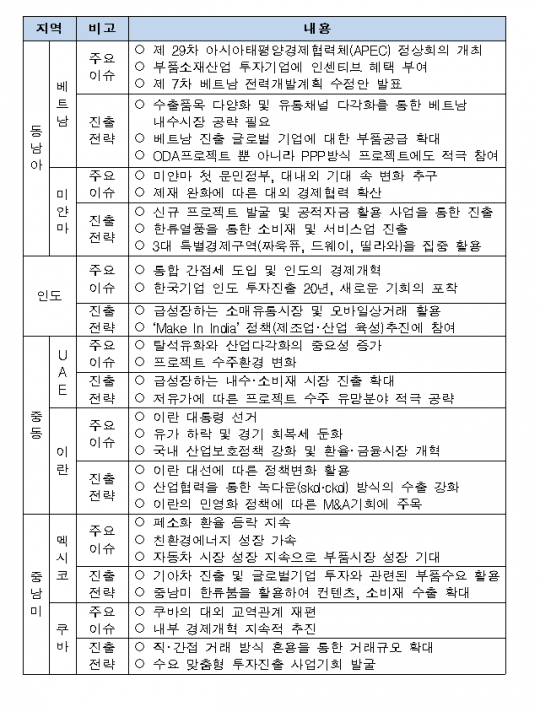 보고서는 각 지역에서 두루 활용될 전략으로 글로벌 온·오프라인 유통망을 활용한 소비재 수출 확대, 4차 산업혁명 시대 관련 신산업분야 공략 등을 꼽았다.