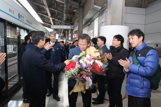 축하를 받고 있는 호칠복 기관사. /서울메트로
