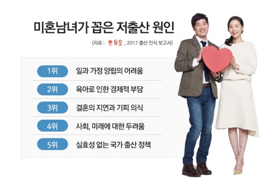저출산의 원인으로는 '일과 가정 양립의 어려움'(27.5%), '육아로 인한 경제적 부담'(26.7%), '결혼의 지연과 기피 의식'(19.1%), '사회와 미래에 대한 두려움'(10.6%), '실효성 없는 국가 출산 정책'(8.7%) 등이 꼽혔다.