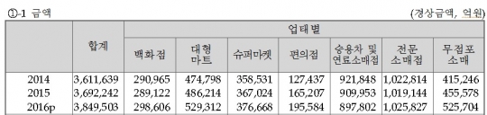 소비판매액을 살펴봐도 백화점과 대형마트, 슈퍼마켓은 소폭 증가한 반면 편의점과 온라인, 홈쇼핑 등의 증감율은 비교적 폭이 컸다. 편의점은 지난해 19조5584억원(2015년16조5207억원)을, 온라인몰과 홈쇼핑 등을 의미하는 무점포소매는 52조5704억원(2015년 45조5578억원)을 각각 기록했다.