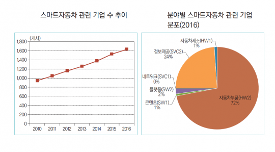 2010년 당시 1000개에 못미쳤던 관련 기업들 숫자도 지난해엔 1600개를 훌쩍 넘어섰다. 분야별(2016년 기준)로는 부품 제조 기업이 72%로 가장 많고 정보제공(24%), 플랫폼(2%) 등의 순이었다.