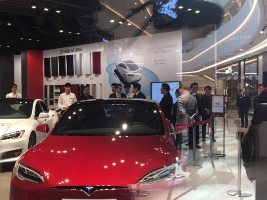 15일 오전 9시 스타필드 하남 2층 테슬라 매장을 찾은 정용진 부회장.