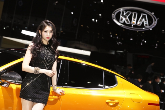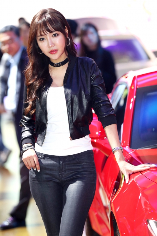 4일 경기도 고양시 킨텍스에서 열린 '2017 서울 모터쇼'에서 레이싱 모델들이 다양한 차량들을 소개하고 있다.