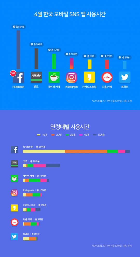 네이버밴드, 네이버카페, 인스타그램, 카카오스토리, 트위터 합친 시간보다 많아