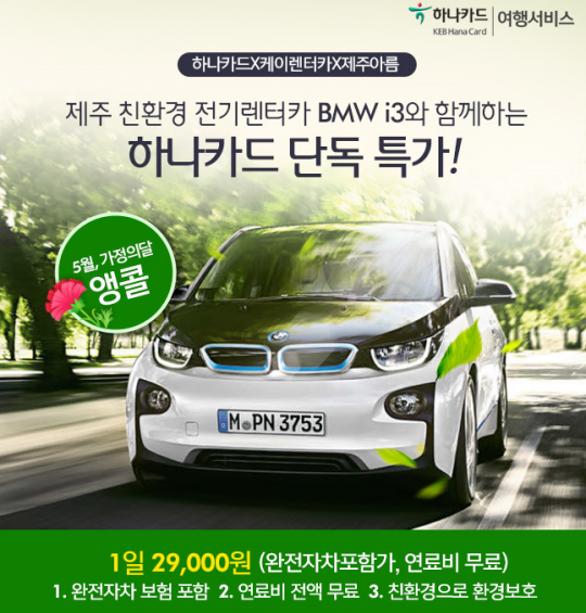하나카드는 내달 말까지 하나카드 홈페이지 내 여행서비스 카테고리에 입점한 제주아름에서 친환경 제주렌터카 BMW i3를 예약할 경우 일반형 i3 LUX는 완전자차 포함 1일 2만9000원에, 고급형 i3 SOL은 1일 3만5000원에 제공한다./하나카드