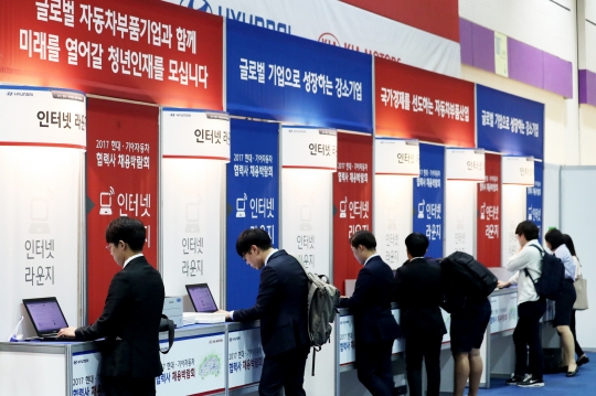 29일 오전 서울 강남구 코엑스에서 열린 '2017 현대·기아자동차 협력사 채용박람회'를 찾은 구직자들이 채용정보게시판을 보고 있다. / 손진영기자 son@