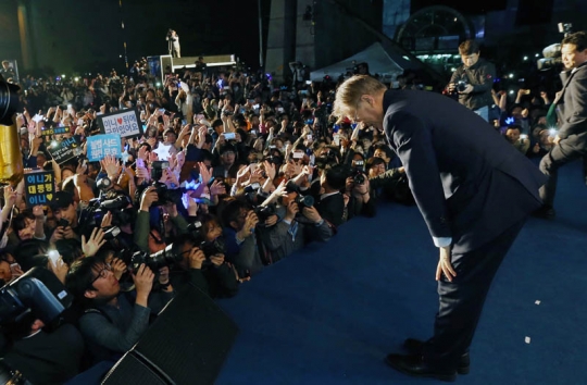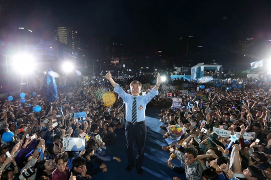 문재인 더불어민주당 대통령 후보가 9일 저녁 당선이 사실상 확정됨에 따라 서울 세종로공원에서 열린 시민들과 함께하는 개표방송에 참석해 지지자들에게 인사하고 있다. /사진제공=더불어민주당
