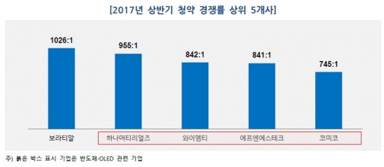 청약경쟁률에서도 반도체·OLED 업종의 활약이 돋보였다. 상반기 청약경쟁률 상위 5개사 중 4개사가 하나머티리얼즈(955대 1), 와이엠티(842대 1), 에프엔에스테크(841대 1), 코미모(745대 1)로 반도체·OLED 업종으로 나타났다. 이탈리아 식자재 수입업체인 보라티알(1026대 1)이 상반기 상장사 중 유일하게 1000대 1 이상의 경쟁률을 기록해 1위에 올랐다.