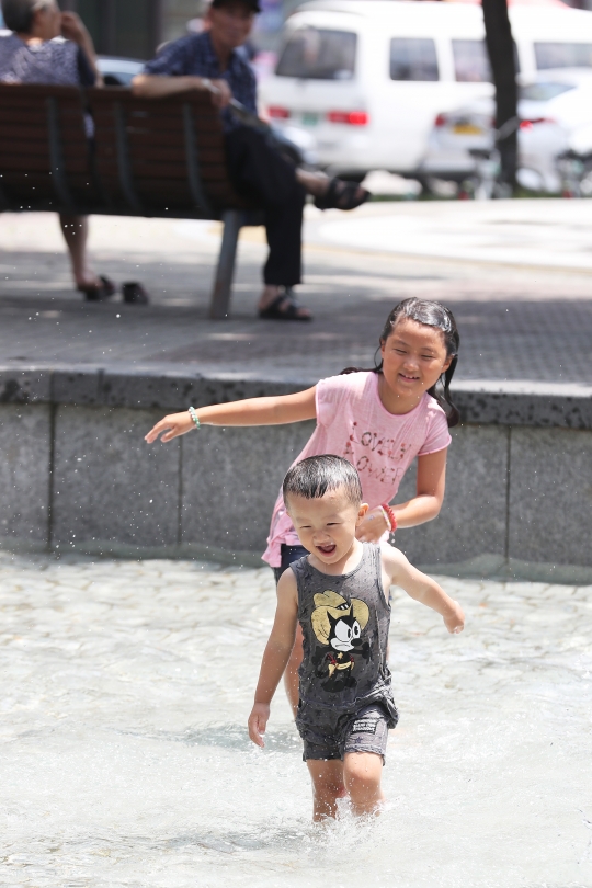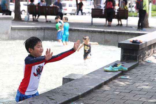 입추에도 불구하고 폭염특보가 발표된 7일 오전 서울 양천구의 한 공원을 찾은 아이들이 물놀이로 더위를 쫓고 있다.