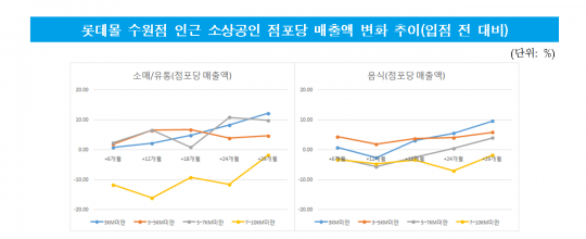 롯데몰 수원점이 들어선 지역의 경우 원거리 상권은 29개월이 지나도록 입점 전 상황을 회복하지 못한 것으로 조사됐다.