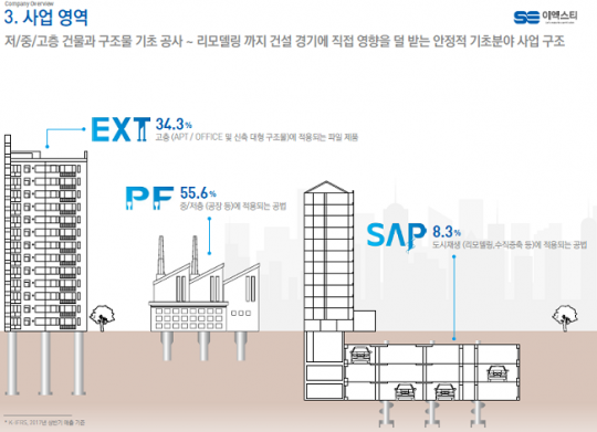 SAP 공법은 고강도 강관에 스크류를 부착한 소구경 파일을 천공과 동시에 설치할 수 있는 기술이다. 주로 리모델링 기초 공사 등 협소한 공간에서 시공할 때 유용하다. 다른 기초보강 공법과 비교해 공사비는 최대 33%까지 줄일 수 있으며 시공속도는 약 1.6배 향상이 가능하다. 또한 도심지 공사에서 저소음으로 시공이 가능한 친환경 공법으로 꼽힌다. SAP 공사의 올해 상반기 매출액은 18억원으로 지난해 32억원과 비슷한 성장세를 보이고 있다.