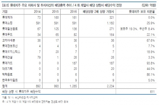 앞서 롯데지주사에 합병된 4개 계열사는 배당성향을 두 배 이상 확대하겠다고 공언했다. 이에 따라 해당 종목별 롯데지주사의 지분비율을 고려해 단순히 계산해보면 롯데지주사의 배당수익은 414억원(기존 배당성향)에서 611억원(변경 배당성향)까지 증대될 예정이다.