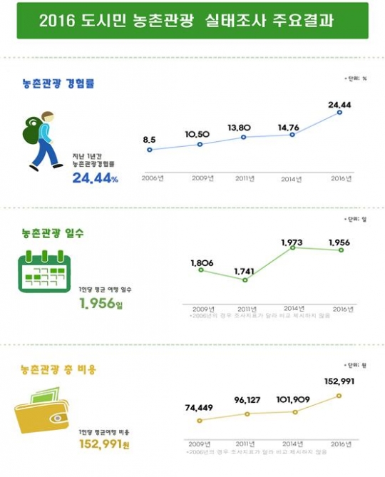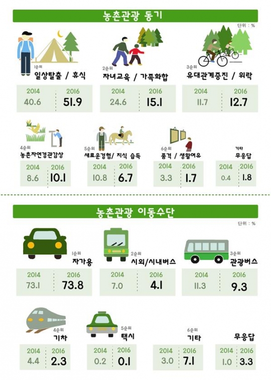 한편, 2016 도시민 농촌관광 실태조사는 올 6월 한달 간 서울 및 6대 광역시 시민 3000명 대상으로 설문지를 이용한 전화면접조사로 진행됐다.