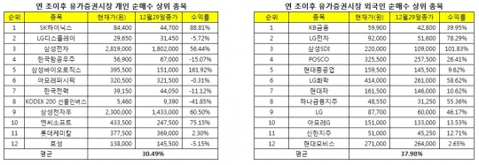 연 초 이후로 확장해서 봐도 흐름은 비슷하다. 이 기간 개미들이 가장 많이 순매수한 상위 12개 종목은 반은 오르고 반은 내리는 상반된 수익률을 보인 반면 외국인의 순매수 상위 종목은 모두 수익을 냈다. 평균 수익률도 외국인(37.98%)이 개인(30.49%)보다 좋았다.