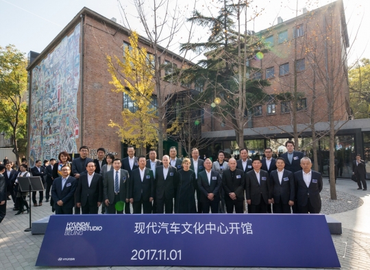 칠성그룹 왕옌링 총재(798 예술구 동사장), 현대차 설영흥 고문, '현대 모터스튜디오 베이징' 디자인 설계사인 2x4 마이클 락 대표, 수잔 셀러 대표, 현대차 정의선 부회장, ARS 일렉트로니카 마틴 혼직 총감독, 현대자동차 이병호 중국사업본부장(좌측 세번째부터)이 '현대 모터스튜디오 베이징' 개관식에 참석해 기념사진을 촬영하고 있다.