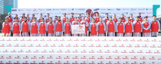 21일 여의도공원에서 진행된 '제7회 사랑의 김치 페어' 행사에서 황영기 금융투자협회 회장과 증권유관기관과 금융투자회사의 CEO들이 기념사진을 촬영하고 있다./금투협