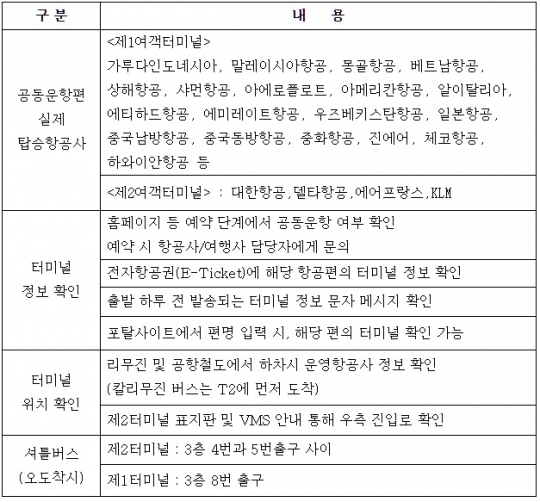여기서 주의할 점은 공동운항편을 이용하는 승객은 티켓을 산 항공사가 아니라 실제로 탑승하는 항공사를 확인한 후 해당 항공사가 있는 터미널을 찾아가야 한다는 점이다.