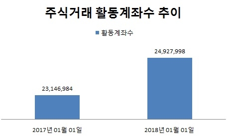 주식거래 활동계좌수도 꾸준히 증가하고 있다. 주식거래 활동계좌수는 19일 기준 2500만5091개로 1년 전(2314만6984개)과 비교해 8.0% 증가했다. 주식거래 활동계좌는 예탁자산이 10만원 이상이면서 6개월간 한 차례 이상 거래한 적이 있는 증권계좌를 뜻한다.