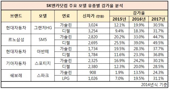 SK엔카닷컴은 2014년식 중고차의 유종별 감가율을 분석한 결과 그랜저 HG, 더 뉴 스포티지 R 등 디젤 차량의 감가 폭이 가솔린 차량보다 크게 나타났다고 26일 전했다.