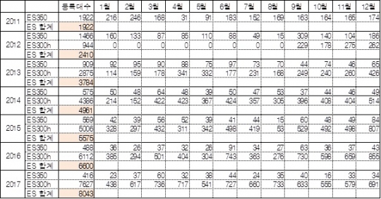 렉서스가 지난해 국내 진출 이래 역대 최고 연간 판매를 기록했다. 특히 2017년 1만2603대의 렉서스 판매 실적에서 ES의 비중이 64%를 차지해 눈길을 끌고 있다.