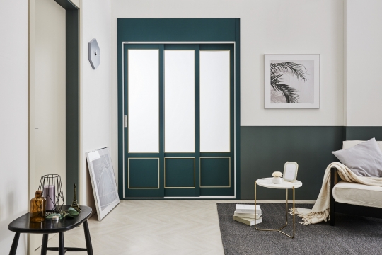 프렌치 스타일은 최근 유행하고 있는 카페스타일의 공간을 연출한다. 세계적인 색채 기업 팬톤이 선정한 2017년도 트렌드 색상 그리너리(Greenery)를 활용해 세련된 느낌을 더했고, 중문의 경우 프레임에 금색 포인트 장식을 넣어 고급스럽게 디자인했다. 철제소재의 가구와도 무난하게 어울린다.
