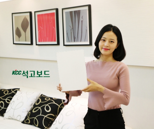 모델이 KCC의 경량 석고보드 '라이트윈(Lightwin)'을 선보이고 있다.