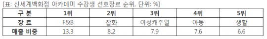 선호 장르 역시 수강생의 90%가 여성 고객인 아카데미의 특성상, 여성 고객들이 관심을 갖는 F&B, 잡화, 여성캐주얼 순으로 나타났으며, 아이를 가진 30대·40대 여성 고객들이 가장 관심 있는 아동과 생활도 선호 장르 상위권에 위치했다.