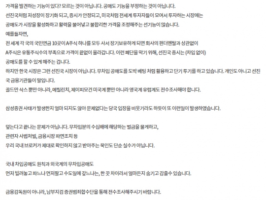 또 다른 청원자는 "공매도는 개인에게 여전히 높은 허들일 뿐만 아니라, 기관과 외국인이 부적절한 방법으로 공매도를 하고 있다면 이는 고스란히 개인투자자의 손해로 전이될 수 있기 때문에 더 문제다"며 공매도를 폐지해야 한다고 주장했다. 실제 금감원에 따르면 2013∼2017년 5년간 68개사가 무차입 공매도 위반으로 제재를 받았다.