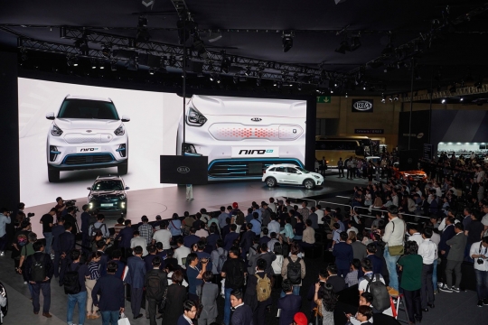 기아차는 '니로 EV'의 내·외장 디자인과 각종 첨단사양들을 세계 최초로 공개했다. 니로 EV는 지난해 2만4000여대가 판매되며 국내 자동차 시장에서 베스트셀링 하이브리드카에 등극한 니로의 전기차 모델로, 1회 충전으로 최소 380㎞ 이상의 주행거리를 갖춘 것은 물론 동급 최대 수준의 실내 공간을 확보해 실용성을 극대화한 것이 특징이다.