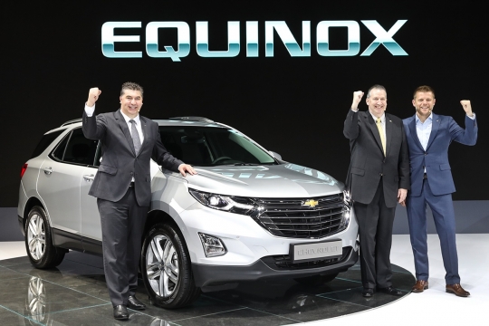 카허 카젬 한국GM 사장과 데일 설리반 한국GM 영업·서비스·마케팅부문 부사장, 스튜어트 노리스 디자인센터 전무(왼쪽부터)가 이쿼녹스와 포즈를 취하고 있다.