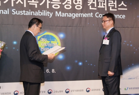 지난 8일 서울시 중구 조선호텔에서 열린 제12회 국가지속가능경영 대상 시상식에서 롯데닷컴 김경호 대표이사(오른쪽)와 한국언론인협회 성대석 회장(왼쪽)이 시상 후 기념촬영을 하고 있다. 롯데닷컴은 기업윤리부문 최고상인 공정거래위원회 위원장상을 수상했다./롯데쇼핑