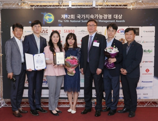 지난 8일 서울시 중구 조선호텔에서 열린 제12회 국가지속가능경영 대상 시상식에서 롯데닷컴 김경호 대표이사(오른쪽에서 세번째)와 임직원들이 시상 후 기념촬영을 하고 있다. 롯데닷컴은 기업윤리부문 최고상인 공정거래위원회 위원장상을 수상했다.