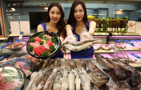 6월 28일(목) 오후 이마트 성수점에서 모델들이 원양선사 수산물 직거래전 상품들을 선보이고 있다./이마트