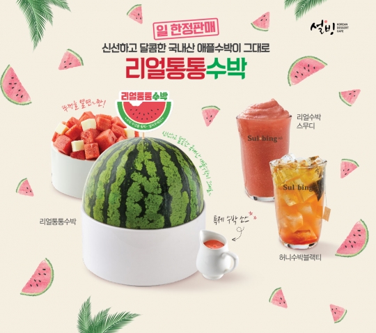 설빙은 여름 한정 시즌 메뉴 '리얼통통수박'을 출시했다. 여름 제철과일 수박 본연의 매력을 최대한 살린 시원하고 청량한 맛으로 남녀노소 부담 없이 즐기기 좋으며, 수박 껍질을 뚜껑으로 활용한 독특한 비주얼로 호기심을 유발한다. 당도가 높은 국내산 애플수박 과육에 상큼한 딸기아이스크림, 부드러운 큐브치즈케이크와 말캉한 코코넛젤리가 조화를 이루고, 여기에 특제 수박 소스가 더해져 맛있게 즐길 수 있다.