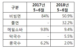 여름 라면의 카테고리도 확대됐다. 올 해에는 여름 라면 신상품이 활발하게 출시되면서 비빔면, 냉면, 콩국수를 포함해 쫄면, 막국수까지 카테고리가 확대됐다. 특히 쫄면과 막국수는 출시 이후 큰 인기를 끌고 있다. 쫄면은 올해 출시된 이후 지난 두 달간(5~6월) 전체 여름 라면 매출의 32.2%를 차지했고, 막국수는 5.5%를 차지했다. 반면, 비빔면은 지난해 5월부터 6월까지, 여름 라면 전체 매출 중 구성비가 84%였지만 올해 같은 기간에는 50.9%로 줄었다.
