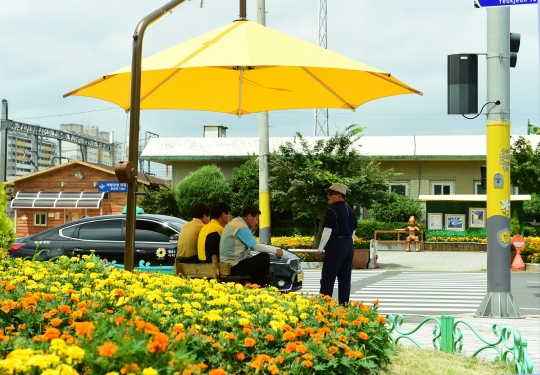 옐로우시티 장성 곳곳에 노란색 대형 파라솔이 설치돼 주민들의 쉼터 역할을 톡톡히 하고 있다.