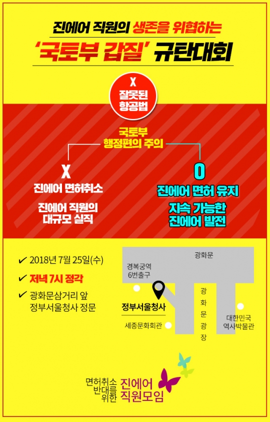 진에어 면허 취소 반대를 위한 직원모임은 25일 오후 7시 광화문광장에서 '진에어 직원 생존을 위협하는 국토부 갑질 규탄대회'를 개최한다. 전날 진에어가 이달 30일 예정된 면허 취소 관련 청문회를 공개로 진행하라고 국토교통부에 요구한 데 이어 진에어 직원들도 전면에 나선 것이다.