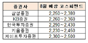 30일 국내 주요 증권사가 제시한 8월 코스피 예상 등락범위(밴드)는 2250~2500 수준이었다. 하단은 2250∼2300으로 큰 차이가 없었고, 상단 전망치는 2360∼2500로 다소 차이가 컸다.