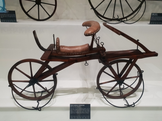 1817년에 제작된 최초의 자전거 '드라이자네'의 모습, 나무로 만들어졌으며 페달이 없다/정연우 기자