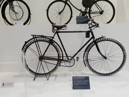 바퀴가 고무가 아닌 스프링으로 제작된 자전거도 있었다. '반더러 스프링 타이어 자전거'리고 불리는 이 제품은 2차대전 시기인 1941년 독일에서 군수물자로 징발된 고무를 대체하기 위해 만들어졌다. 배부영 연구사는 "이 자전거는 바퀴가 스프링으로 만들어졌지만 이동수단으로서의 기능은 충분히 수행했다"고 설명했다.
